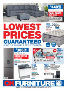 R286 x 36 MONTHS Deposit R530. Total Payable R10260 at 24% Int. CASH R5299 SAVE R1000 FIRM R335 x 36 MONTHS Deposit R650. Total Payable R12060 at 24% Int. CASH R6499 SAVE R1000 152cm Neria Pillow-Top Base Set PATENTED MARVELOUS MIDDLE Queen 152cm Rest Zone Base Set 1-Year Guarantee included in a 10-year service warranty Queen NEW 1-Year Guarantee included in a 10-year service warranty MEDIUM/ SOFT MEDIUM/ SOFT 2-Year Guarantee included in a 10-year service warranty 2-Year Guarantee included in a 10-year service warranty PATENTED MARVELOUS MIDDLE PATENTED MARVELOUS MIDDLE R233 x 30 MONTHS Deposit R360. Total Payable R6982 at 24% Int. CASH R3599 SAVE R400 137cm Logan Base Set Double 1-Year Guarantee included in a 5-year service warranty FIRM R273 x 36 MONTHS Deposit R500. Total Payable R9813 at 24% Int. CASH R4999 SAVE R2000 Double 137cm Espresso Base Set FIRM 1-Year Guarantee included in a 10-year service warranty 152cm Logan Base Set R3799, Save R500 ALSO AVAILABLE 12 VALID 6 - 19 OCTOBER 2025, WHILE STOCKS LAST. Ts & Cs APPLY. For details on your nearest branch visit www.okfurniture.co.za CUSTOMER CARE LINE: 0861 00 88 61 or 0861 11 32 13 SASAOKF2594 FOR YOUR NEAREST STORE PLEASE VISIT OUR WEBSITE, FACEBOOK PAGE, OR CONTACT OUR CUSTOMER CARE LINE. Prices advertised are applicable within South Africa only. Instalment amounts displayed include VAT, interest, credit life insurance, monthly service and initiation fee, if applicable, but excludes optional insurance and delivery charges. All credit applications are subject to an affordability assessment as is required by the NCA and its Regulations. Requirements for credit applications must include your ID document, latest three payslips and/or bank statements, proof of residence not older than three months and monthly expenses. Deposit may have to be paid, subject to your credit assessment. SMS for credit – SMS Costs Apply. Standard Ts & Cs apply. Lay-by is available on selected products. Minimum deposit of R100 per lay-by. Find any item cheaper at any other retailer, provide us with a current catalogue or quote and we will refund the difference plus 5% of the difference, on condition that the identical product must be in stock at the time at the local retailer. This offer however excludes Store Openings, Clearances and Limited Quantity offers. Products can be purchased from all of our branches, some products may not be on display in all stores. Accessories displayed are all displayed as extras and are not included in the advertised price. Stock and quantities may be limited at our discretion. No Dealers allowed. Consumers purchasing TV sets must produce their ID document, proof of residence and a valid TV Licence as required by legislation. Cellphone purchases are subject to RICA requirements, Service Providers’ Ts & Cs and in-store activation. Should an error occur or incomplete information be printed in this advertisement, we will display a notice in-store with all the correct details. Errors and omissions excepted. Rainbow Finance is a trading division of Shoprite Financial Services Ltd, an Authorised Credit Provider (NCRCP6050), and an Authorised Financial Services Provider (FSP 7732). Proud to be NCA compliant. MEDIUM Queen 152cm Tanzanite Pillow-Top Base Set R356 x 36 MONTHS Deposit R700. Total Payable R12809 at 24% Int. CASH R6999 SAVE R1000 R440 x 36 MONTHS Deposit R900. Total Payable R15809 at 24% Int. CASH R8999 SAVE R1000 183cm Tanzanite Pillow-Top Base Set King