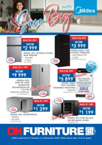NOW R2 999 NOW R1 199 WAS R3 299 WAS R1 349 MIDEA 87L DOUBLE DOOR BAR FRIDGE - SILVER - LOCK HD-113FN MIDEA 25 LITRE BLACK MICROWAVE OVEN EM25BLACK SCAN TO VISIT OUR WEBSITE NOW R3 999 WAS R4 499 MIDEA 204L TOP MOUNT FREEZER - ANTHRACITE - LOCK HD-273FN-BLACK NOW R5 899 MIDEA 16KG TOP LOADER WASHING MACHINE - WHITE MA512W160-T NOW R1 299 WAS R1 599 MIDEA 30L MICROWAVE - 900W - SILVER EM30SILVER Offers valid from 27 October to 2 November 2025. While stocks lasts. Ts & Cs Apply. with SaveBig NOW R9 999 MIDEA 513L SIDE BY SIDE INVERTER REFRIGERATOR - SILVER - DIGITAL DISPLAY HC-689WEN-S WAS R11 999 WAS R6 499 SAVE R300 SAVE R500 SAVE R300 SAVE R150 SAVE R2 000 SAVE R899 New & Exclusive New & Exclusive Exclusive BUY THE 16KG WHITE TOP LOADER AND GET A MANCHESTER SOCCER BALL VAUED AT R299.99 FOR FREE