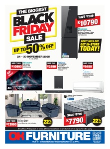 Shop Black Friday deals in-store. Offers are available on credit, but not on lay-by. Ts & Cs apply. SAVE K2009 K6990 107cm Vertapaedic Base Set 152cm Symphony Base Set SAVE K4009 K9990 152cm Econopedic Base Set 3-Quarter Queen King SAVE K6009 K17990 183cm Ortho Line Pillow-Top Base Set SAVE K4009 K11990 183cm Econopedic Base Set SAVE K4009 K13990 152cm Rest Zone Base Set Queen 25 29 25 24 - 30 NOVEMBER 2025 Ts & Cs APPLY. King 24 SAVE K7209 K22790 183cm Chiro-Zone Pillow-Top Base Set Queen SAVE K3709 K12790 THE BIGGEST SALE King Prices advertised are applicable within Zambia only. All Terms include an initial payment, Sales Tax (subject to change) and interest, but exclude insurance and delivery charges, unless otherwise stated. Accessories displayed are all displayed as extras and are not included in the advertised price. Bring your ID, proof of residence (not older than three months) and three months’ latest payslips/salary advice to ensure rapid response to your credit application. Finance provided by Connect Financial Solutions, a division of JD Home-Tech Zambia Ltd. (Reg No: 120241010728). Enquire in-store for more details or contact (00260) 97 7717 510. Standard Terms and Conditions apply. All products indicated in litres are in nett value. Should you find any item cheaper at any other retailer, provide a quote or current catalogue and we will refund the difference plus 5% of the difference. This is conditional on the day of the purchase from OK Furniture and the period for which the price from OK Furniture is valid for, and not thereafter. This offer excludes Store Openings, Clearances and Limited Quantity offers. Due to our vast range, all products may not necessarily be on display in all stores. Should an error occur, or incomplete information be printed in this advertisement, we will display a notice in-store with all the correct details. BRANCHES: CHILILABOMBWE: (00260) 212 380 978, KITWE: (00260) 212 280 010, MANDA HILL: (00260) 211250 772/785, MAZABUKA: (00260) 213 230 031, MONGU: (00260) 217 221 646, NDOLA: (00260) 212 615 110, SOLWEZI: (00260) 212 882 1852/384, MANSA: (00260) 0211 212 81206/821201, CHIPATA: (00260) 0211 216 222 674, KASAMA: (00260) 0211 214 2230/222011, HEAD OFFICE: +27 11 408 0408 or (00260) 97 7717 510. No Dealers allowed. E&OE. VALID 24 - 30 NOVEMBER 2025, WHILE STOCKS LAST. For details on your nearest branch visit www.okfurniture.co.za ZAZAOKF272 https://www.facebook.com/okfurnitureZambia https://www.instagram.com/okf_zambia/ CUSTOMER CARE LINE: +27 11 408 0408 / okfurniture@pl.co.za PATENTED MARVELOUS MIDDLE PATENTED MARVELOUS MIDDLE PATENTED MARVELOUS MIDDLE