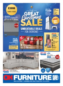 3-Piece Montego Corner Lounge Suite • Accessories not included BEZEL LESS DESIGN Full HD SmartLED TV 50A4Q • 4-Year Guarantee ALSO AVAILABLE HISENSE 55” (140cm) 4K Smart LED TV 55A6Q E7199, Save E300 ALSO AVAILABLE PS5 DualSense Controller E1499, Save E250 PS5 Slim Disc Console with 1 Controller Queen 152cm Osaka Pillow-Top Base Set 1-Year Guarantee included in a 10-year service warranty MEDIUM NEW NEW E13499 SAVE E1000 E4999 SAVE E600 VALID 20 OCTOBER – 9 NOVEMBER 2025, WHILE STOCKS LAST. Ts & Cs APPLY. SCAN TO VIEW OUR LATEST DEALS COLOUR MAY VARY CELLULAR AVAILABLE ON CREDIT - ENQUIRE IN STORE SAVE E1000 E9999 SAVE E1000 E6499 Grey Twin-Tub Washing Machine WSDE163G • 2-Year Guarantee SAVE E1000 E3999 EXCLUSIVE 50” 127cm THE GREAT Christmas UNBEATABLE DEALS FOR EVERYONE! GREAT GIFT IDEA E1899 SAVE E500 8MP Selfie Camera 50MP + 2MP Main Camera 4GB Memory 64GB Storage 6.7” 5000mAh (25W Fast Charging) each Galaxy A05 4G Smartphone 16kg EXCLUSIVE