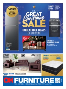 Queen VALID 20 OCTOBER - 9 NOVEMBER 2025, WHILE STOCKS LAST. Ts & Cs APPLY. SCAN TO VIEW OUR LATEST DEALS FERRE 2-Burner Gas & 2-Plate Electric Stove 3-Piece Fara Lounge Suite • Accessories not included K16999 SAVE K2000 K869 PM X18 Deposit K4250. 152cm Econopedic Base Set K11999 SAVE K2000 K619 PM X18 Deposit K3000. 43” 109cm Full HD Android LED TV K6999 SAVE K1000 K368 PM X18 Deposit K1750. 161l ENERGY RATING A K7799 SAVE K700 K409 PM X18 Deposit K1950. Titanium SilverFinish TopFreezer Fridge H225TTS K7499 SAVE K500 K399 PM X18 Deposit K1875. THE GREAT Christmas UNBEATABLE DEALS FOR EVERYONE!